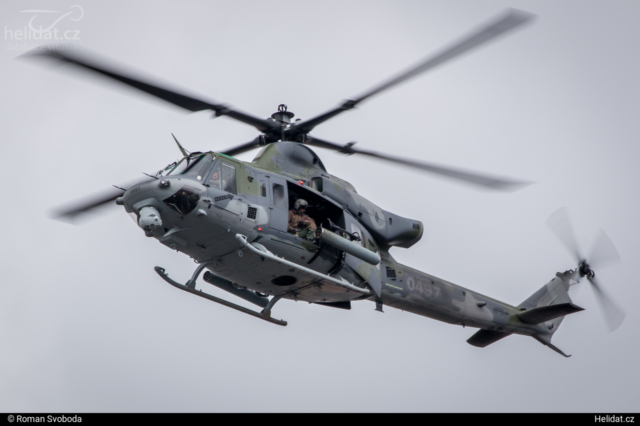 Bell UH-1Y Venom trupového čísla 0497 je středně těžký americký víceúčelový desetimístný vrtulník v kamufláži AČR s čtyřlistým nosným rotorem a čtyřlistým vyrovnávacím rotorem. Je vybaven pevným ližinovým podvozkem. Je poháněn dvěma motory T700-GE-401C.Časová osa vrtulníku