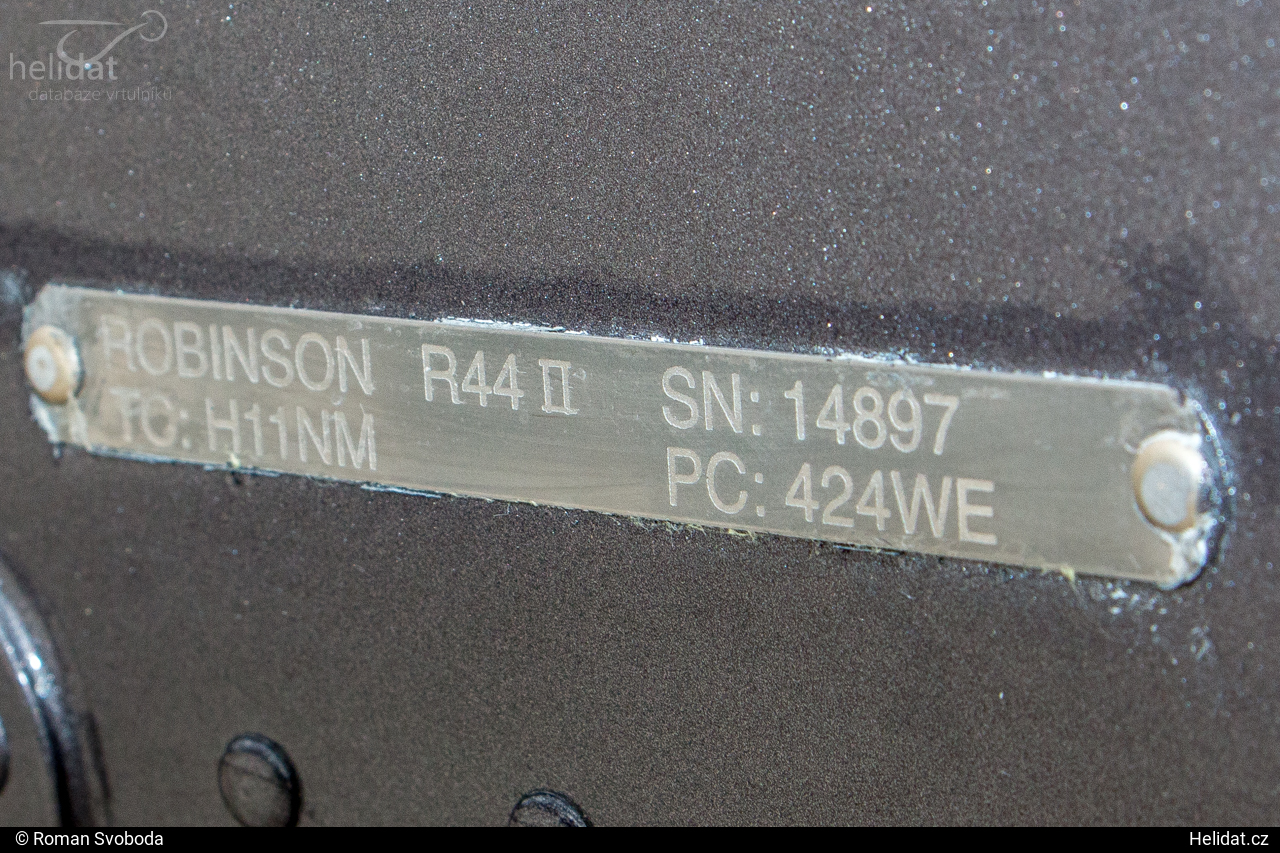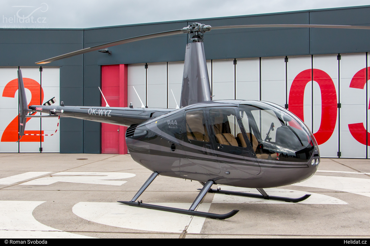 Robinson R44 Raven II registrační značky OK-WYZ (v.č. 14897) je lehký americký víceúčelový čtyřmístný šedo-černý vrtulník s dvoulistým nosným rotorem a dvoulistým vyrovnávacím rotorem. Je vybaven pevným ližinovým podvozkem. Je poháněn jedním motorem Lycoming IO-540-AE1A5.Časová osa vrtulníku